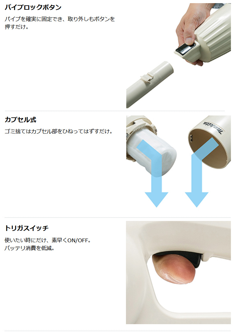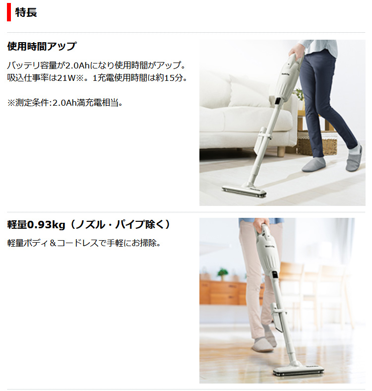 使用時間アップでさらに使いやすい! プロ愛用の「マキタ」のコードレス掃除機! これ一台で家中お掃除! コードレスだからいろんな場所で活躍♪ 階段も片手でスイスイ。エアコンなど高い場所もラクラク! ソファー下にもスイスイ入る! 使用時間がアップ!!連続使用時間約15分※従来品比 【軽量約930g】 女性でもラクラク 【コードレスでもハイパワー!】 ・吸込仕事率21w ・新幹線の車内清掃など、業務用に使われているモデルを家庭用に改良! 【ぐんぐん吸引!】 充電式なのに強力な吸引力! 【2WAY】ハンディに、スティックに 【パイプロックボタン付き】 パイプを確実に固定し掃除中も外れにくい! 【紙パック不要】 カップを逆さにするだけでゴミ捨て簡単! ●充電式