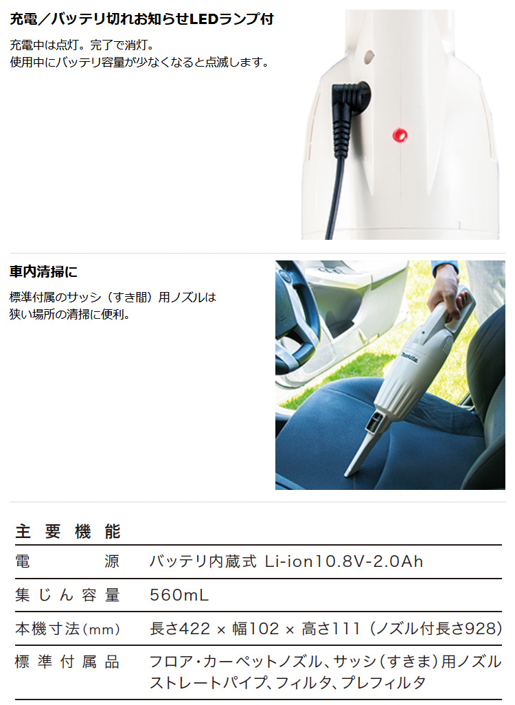 ●(約)/<本体>幅10.2×長さ42.2(ノズル取付け時92.8)×高さ11.1cm、930g(パイプノズル含まず) ●集じん容量/約560mL ●電源/充電式(リチウムイオンバッテリー) ●充電時間/約4時間 ●使用可能時間/約15分 ●吸込仕事率/21W ●付属品/充電器、フロア・カーペットノズル、サッシノズル、ストレートパイプ、ノズルホルダ ●取扱説明書(保証書付) ●日本製