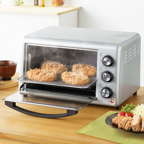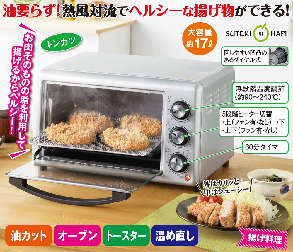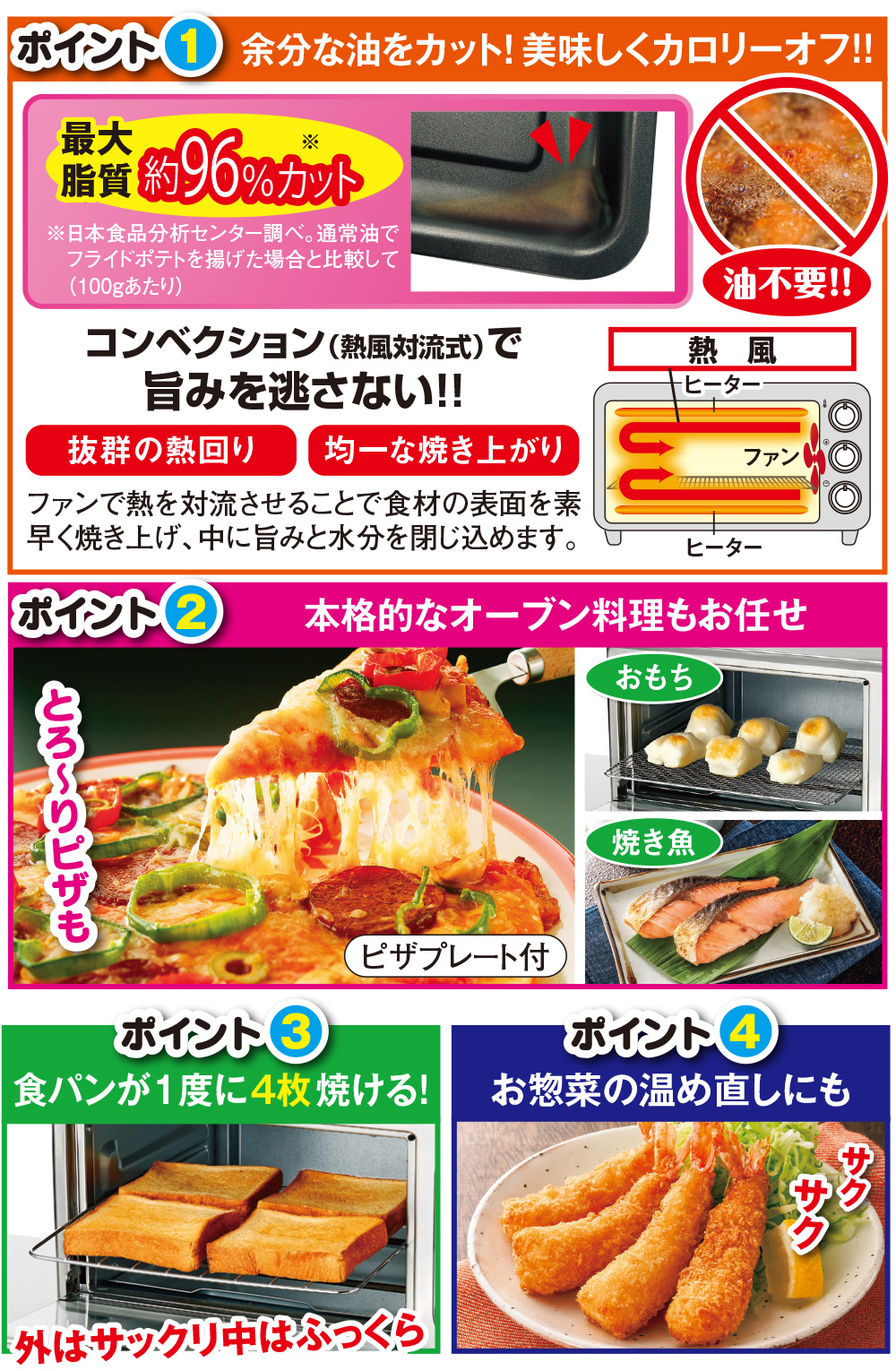 大容量17L!上下ヒーターと熱風対流で油を使わないヘルシー調理! 外はカリッと中はジューシー グラタンもとろ~り♪ 余分な油をカット!美味しくカロリーオフ!! 最大脂質約96%※カット ※日本食品分析センター調べ。通常油でフライドポテトを揚げた場合と比較して(100gあたり) お肉そのものの脂を利用して揚げるからヘルシー! 無段階温度調節(90~240度) 5段階ヒーター切替・上(ファン有・なし) ・下・上下(ファン有・なし) 60分タイマー 回しやすい凹凸のあるダイヤル式 【コンベクション(熱風対流式)で旨みを逃さない!!】 ●抜群の熱回り ●均一な焼き上がり ファンで熱を対流させることで食材の表面を素早く焼き上げ、中に旨みと水分を閉じ込めます。 ●揚げ料理 ●温め直し ●焼く 外はサックリ 中はふっくら 食パンが1度に4枚焼ける! コンパクトなのに庫内は広々!毎日幅広く活用できます!! 【もち焼き網】 おもちもふっくら焼ける! 【ピザプレート】 直径約25cmで、外はパリッ、中はもちもちのピザも!