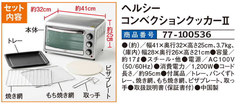 ●(約)/幅41×奥行32×高さ25cm、3.7kg、〈庫内〉幅28×奥行26×高さ21cm ●容量/約17L ●スチール・他 ●電源/AC100V(50/60Hz) ●消費電力/1200W ●コード長さ/約95cm ●付属品/トレー、パンくずトレー、焼き網、もち焼き網、ピザプレート、取っ手 ●取扱説明書(保証書付) ●中国製