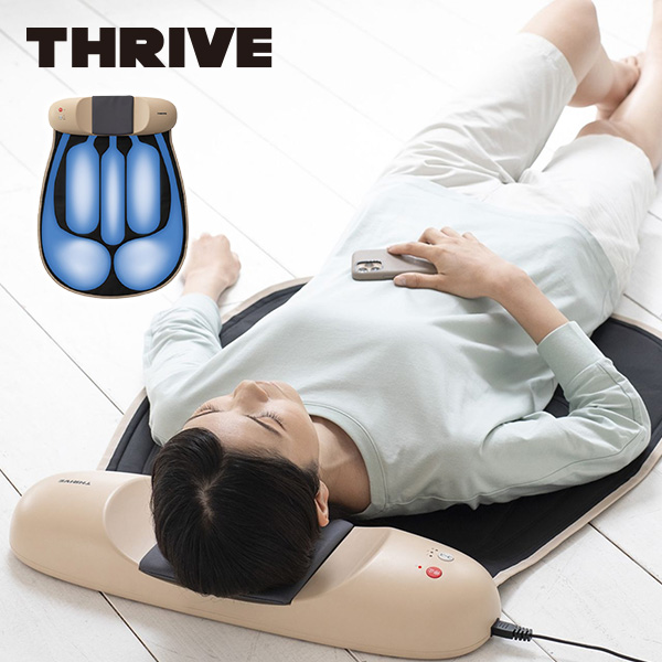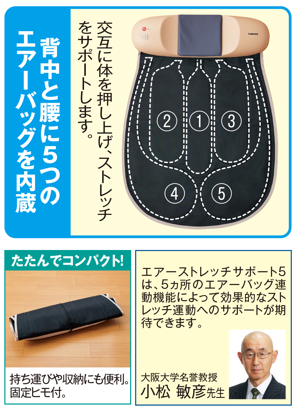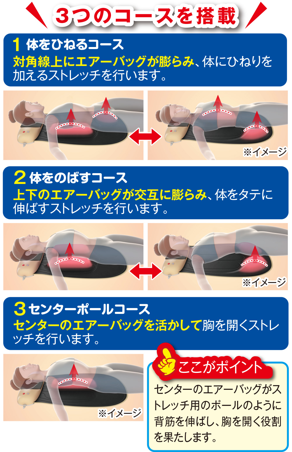 寝るだけ簡単、手軽にお部屋で簡単ストレッチ! 5つのエアーバッグが背中と腰を押し上げ体を伸ばします <おすすめ!寝ながらストレッチ> ●脱力した状態でできる ●無理なく体を伸ばす ●簡単で続けやすい <3つのコースを搭載> 【体をひねるコース】対角線上にエアーバッグが膨らみ、体にひねりを加えるストレッチを行います。 【体をのばすコース】上下のエアーバッグが交互に膨らみ、体をタテに伸ばすストレッチを行います。 【センターポールコース】センターのエアーバッグを活かして胸を開くストレッチを行います。