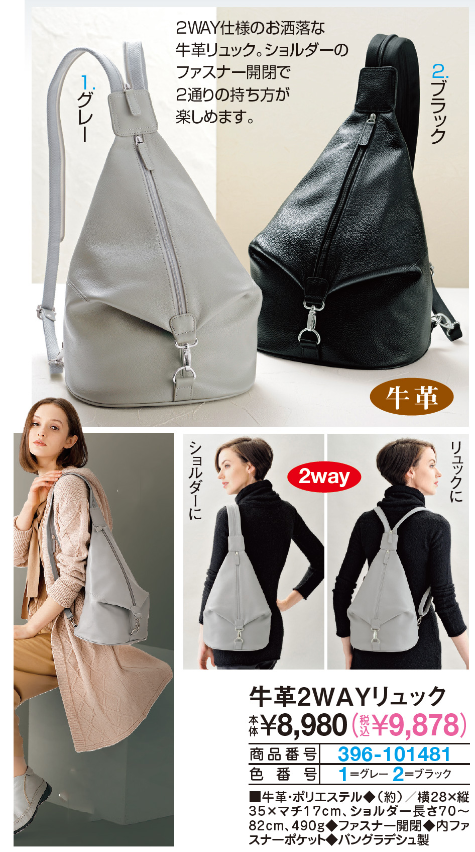 2WAY仕様のお洒落な牛革リュック。