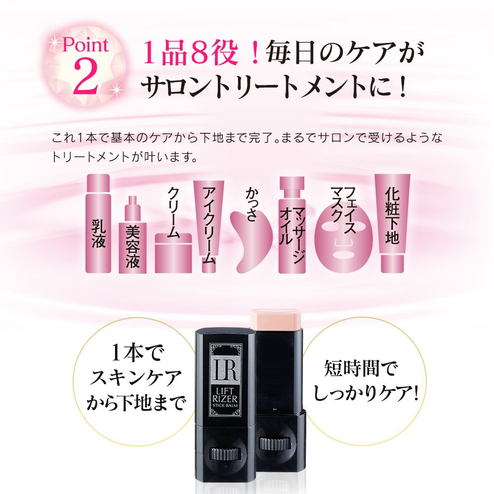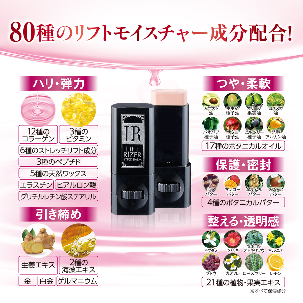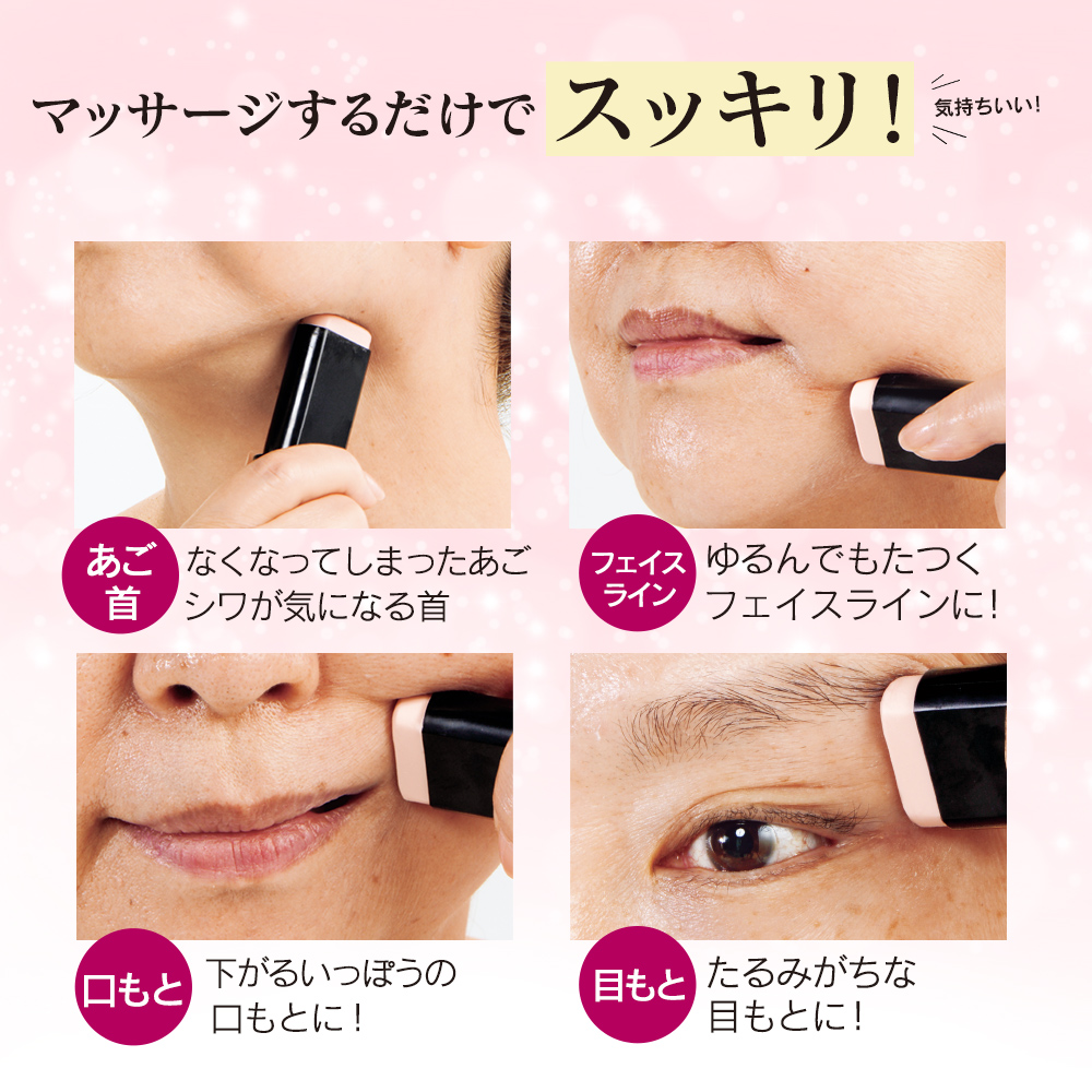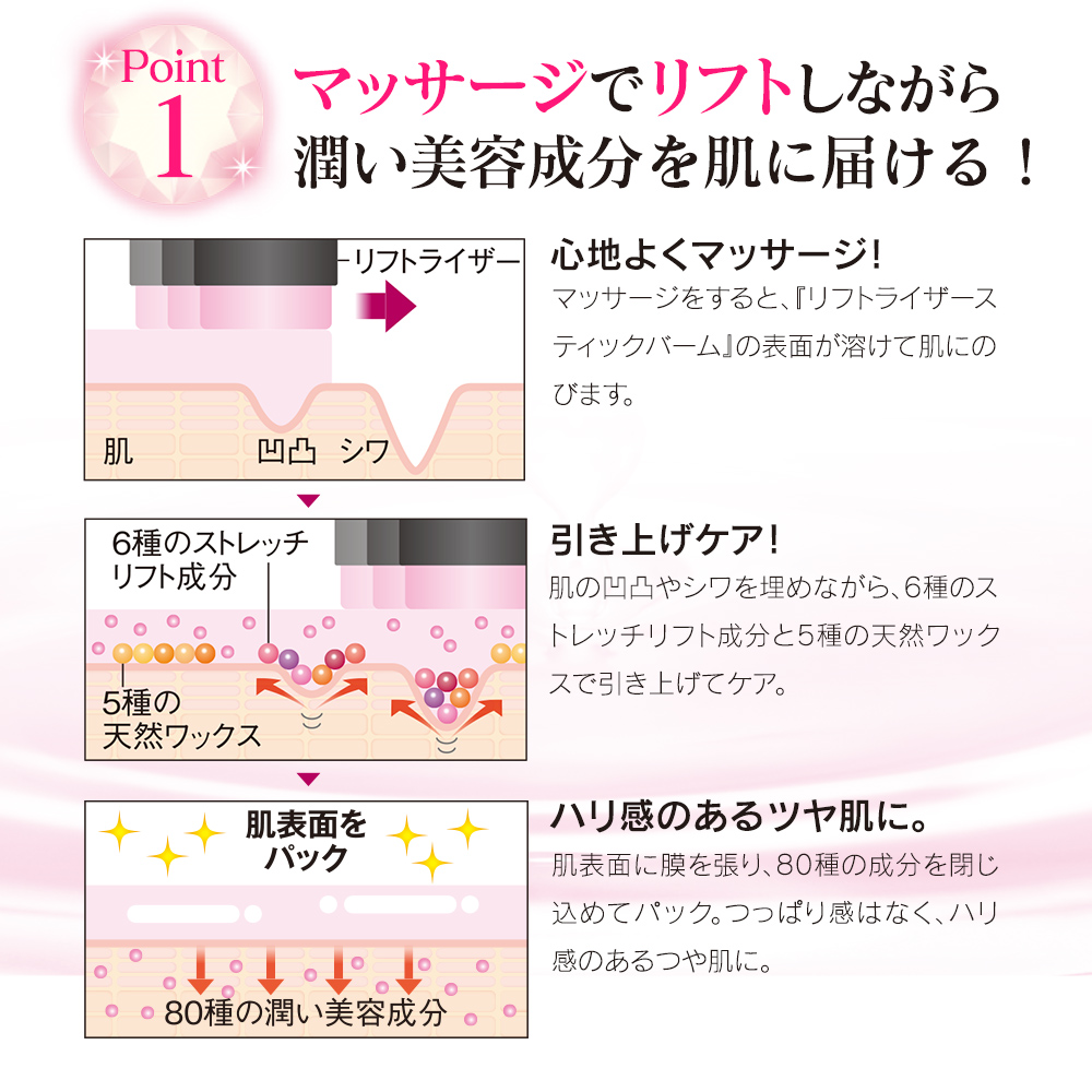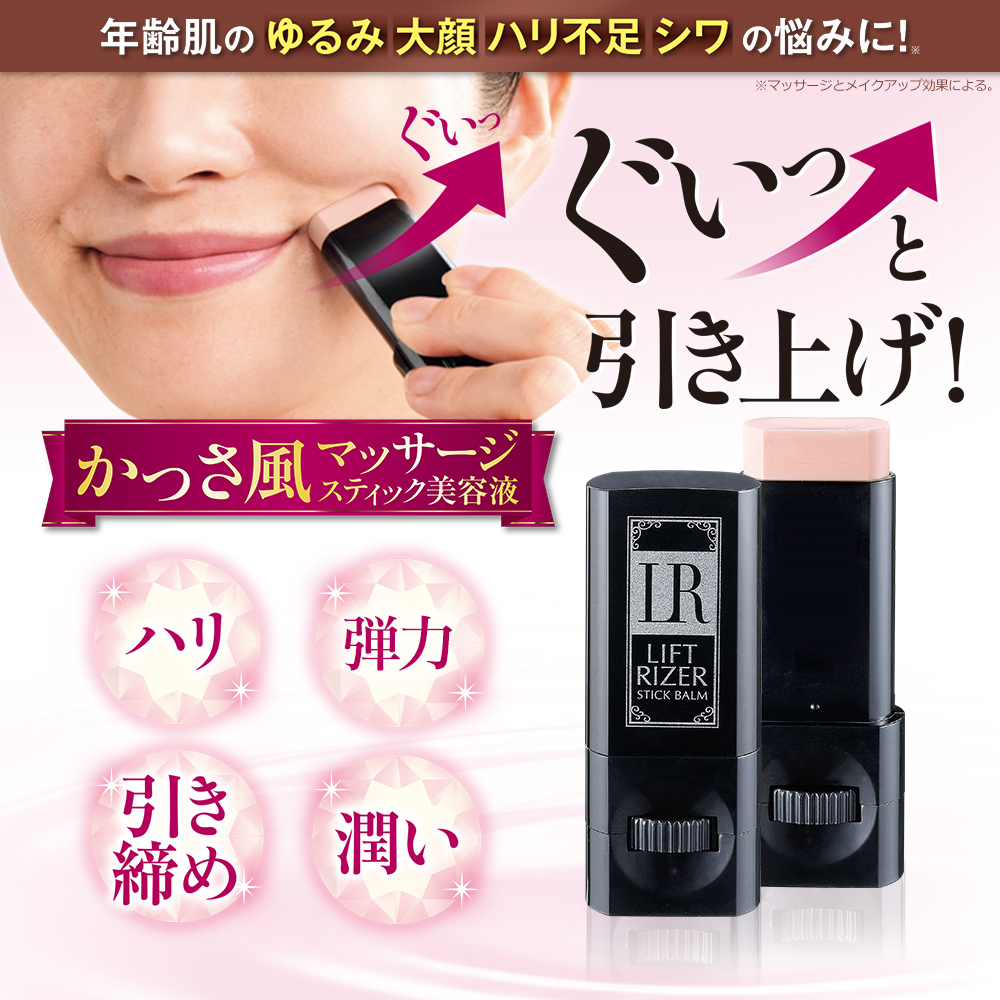 年齢肌の【ゆるみ】【大顔】【ハリ不足】【シワ】の悩みに!(※) ぐいっと引き上げ!かっさ風マッサージスティック美容液! ■80種のリフトモイスチャー成分配合! ■マッサージでリフトしながら潤い美容成分を肌に届ける! ■1品8役!毎日のケアがサロントリートメントに! ※マッサージとメイクアップ効果による。