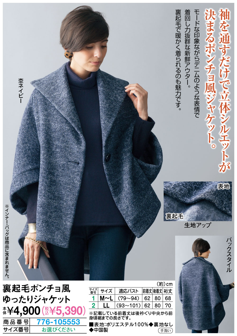 袖を通すだけで立体シルエットが決まるポンチョ風ジャケット! モードな印象ながらデニムのような表情で着回し力抜群な新鮮アウター。 裏起毛で暖かく着られるのも魅力です。