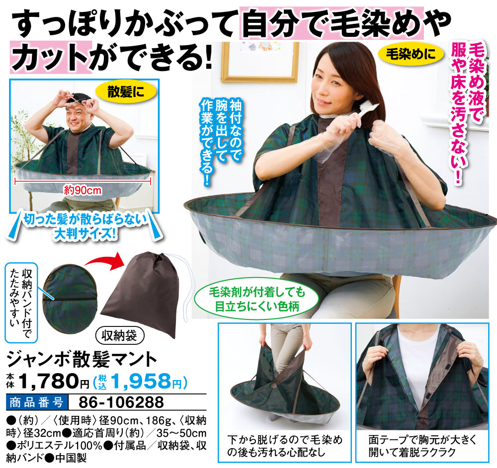 すっぽりかぶって自分で毛染めやカットができる! 毛染めに:毛染め液で服や床を汚さない! 毛染剤が付着しても目立ちにくい色柄 散髪に:切った髪が散らばらない大判サイズ! 袖付なので腕を出して作業ができる! 面テープで胸元が大きく開いて着脱ラクラク 下から脱げるので毛染めの後も汚れる心配なし 収納バンド付でたたみやすい ●収納袋
