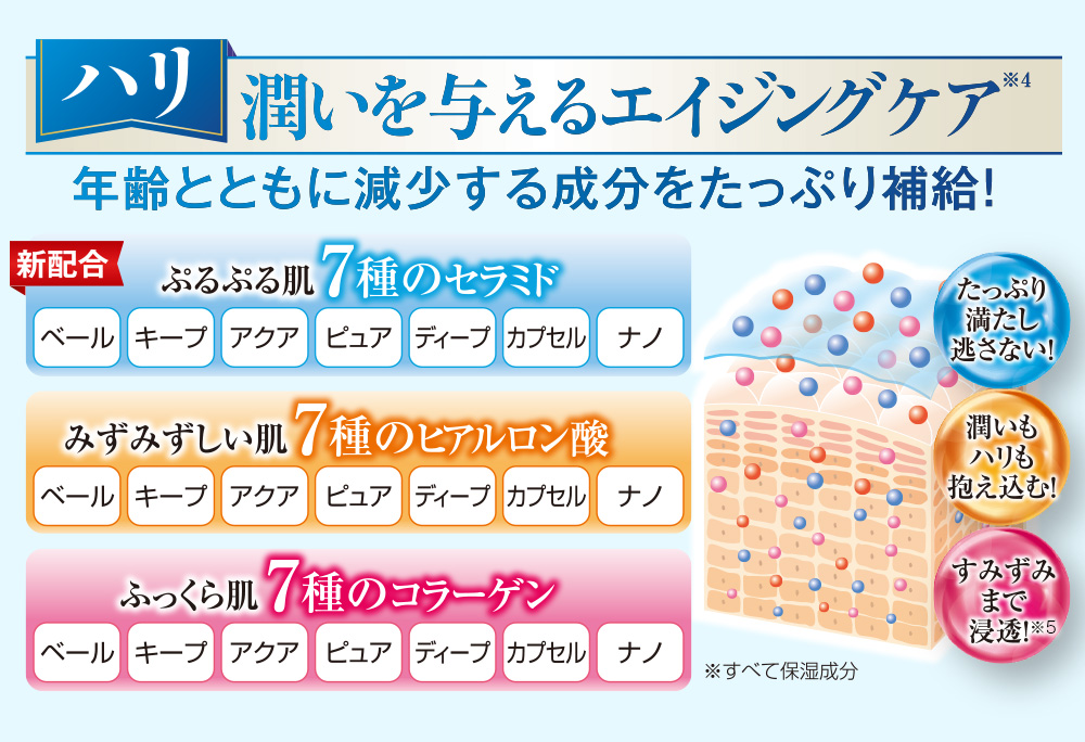 美白(※1)もリフトも進化! シミ(※1)対策に!ハリ対策に! 乾燥小ジワを目立たなくする。 効能評価試験済み 年齢肌のための1品7役! 【シミ】ダブル有効成分ホワイトニング(※1) ・美白(※1)/アルブチン ・抗炎症/グリチルリチン酸ジカリウム 【ハリ】潤いを与えるエイジングケア(※4) ・ぷるぷる肌/7種のセラミド ・みずみずしい肌/7種のヒアルロン酸 ・ふっくら肌/7種のコラーゲン ◎潤い美容成分合計52種配合! 7種のセラミドと天然由来の3種のストレッチリフト成分も新配合!