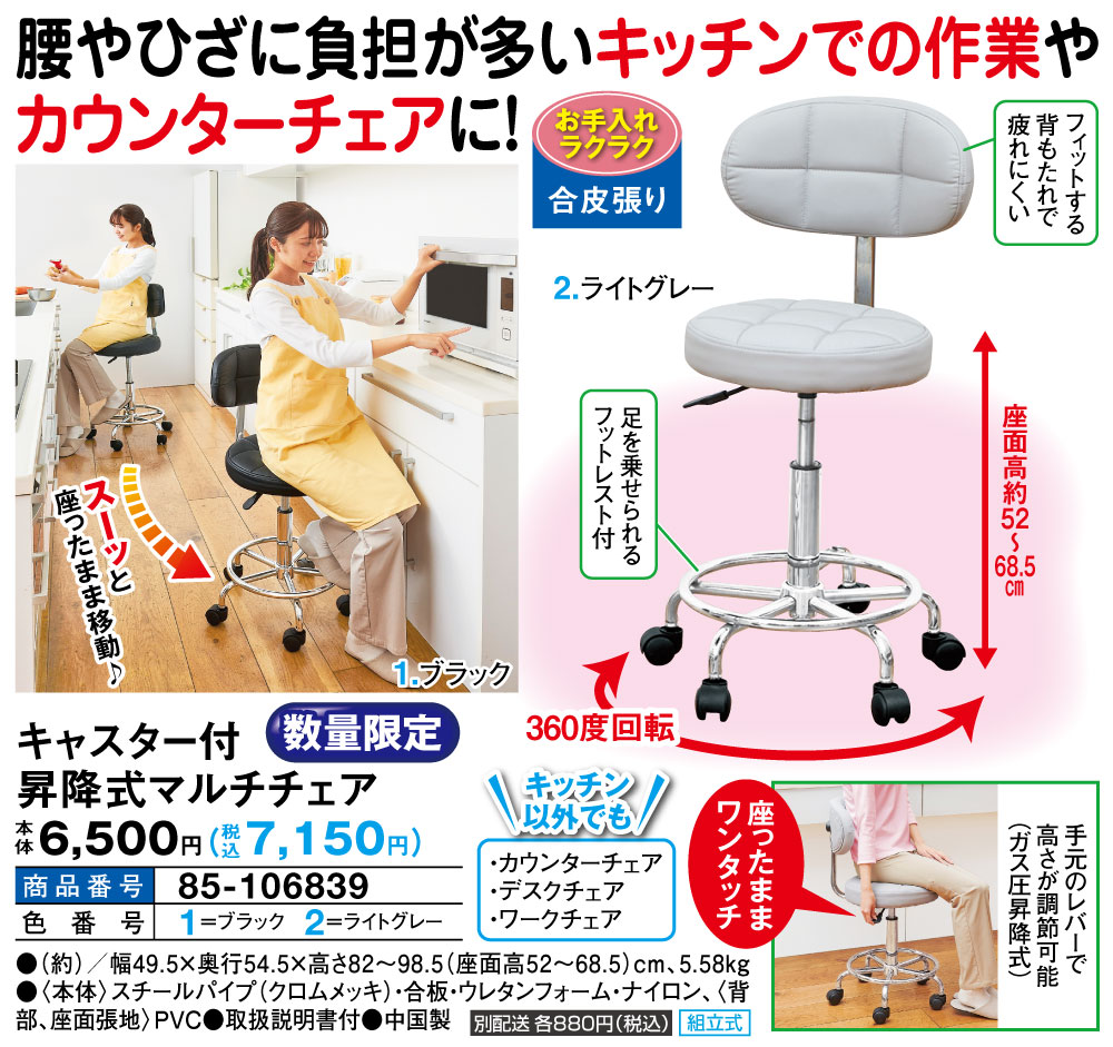 キッチンでの作業をサポート!便利に使えるバックレストマルチチェア! 背もたれが腰にフィットして疲れにくいのでラク! 足を乗せられるフットレスト付 背もたれ(バックレスト)付 来客時の補助チェアとしても \キッチン以外でも/ ・カウンターチェア ・デスクチェア ・ワークチェア 360度回転 キャスター付 座面高約52~68.5cm 座面を高めに調節すれば立った状態に近い姿勢で作業がラク♪ 【座ったままワンタッチ】 手元のレバーで高さが調節可能(ガス圧昇降式) ●お手入れラクラク合皮張り