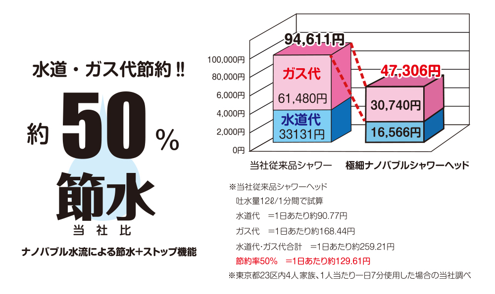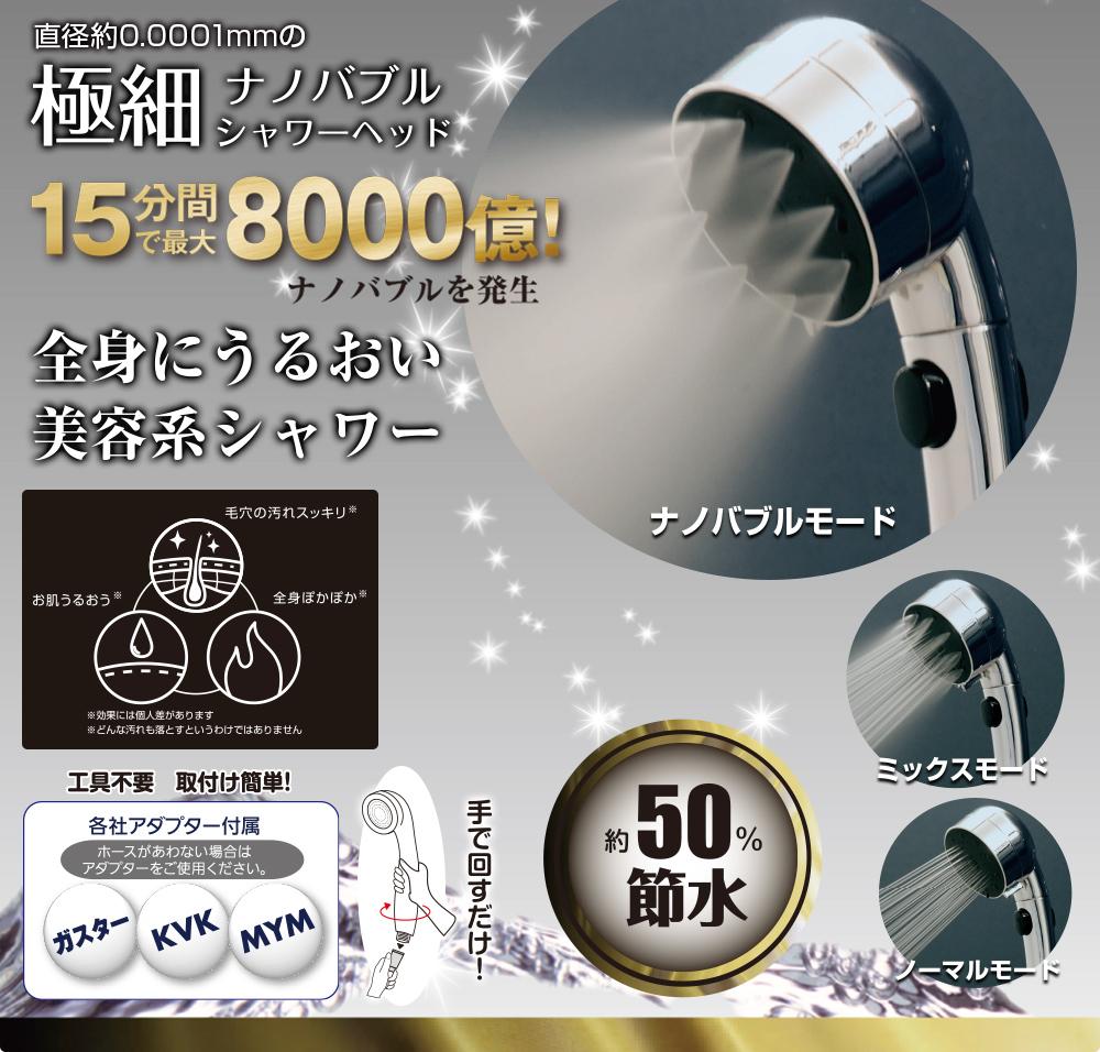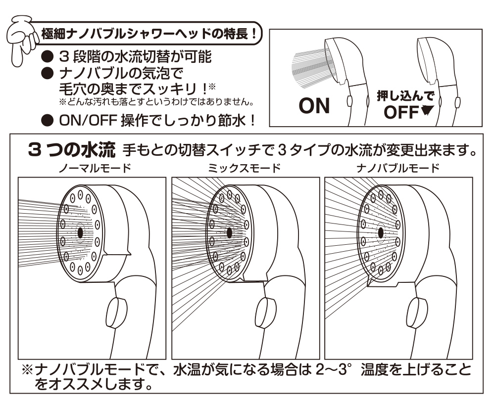 ナノバブル水流を発生させる! 極細ナノバブルシャワーヘッド登場! 直径約0.0001mmの超微細な泡でお肌スッキリ! 全身にうるおいを与える美容系シャワーヘッドです。 3段階の水流切替が可能。 ON/OFF操作でしっかり節水。
