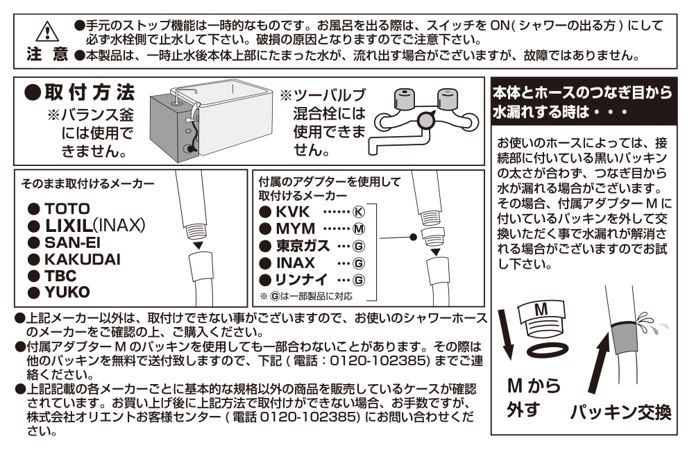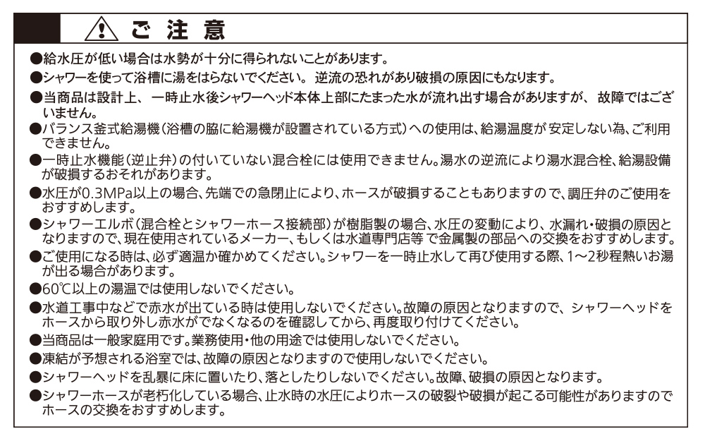 ●商品サイズ/重量:約25×8×8cm 約180g ●個装サイズ/重量:約28×11×8cm 約320g ※KVK、MYM、ガスター用アダプター付属 ●使用水圧/0.05MPa(0.5kgf/cm²)~0.75MPa(7.5kgf/cm²) ●最高使用温度/60℃ ●材質/シャワーヘッド本体:ABS樹脂、散水板:ABS樹脂、パッキン:シリコン/EPDM、切替ボタン:ABS樹脂、アダプター:ABS樹脂 ●生産国/中国