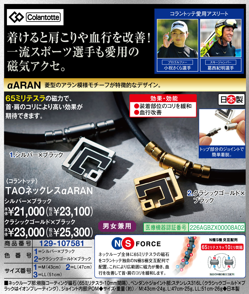 TAOシリーズ最強65ミリテスラの磁力で、首・肩のコリにより高い効果が期待できます。 トップ部分のジョイントで簡単着脱。 効果・効能 ●装着部位のコリを緩和 ●血行改善 NS FORCE ネックループ全体に65ミリテスラの磁石をコラントッテ独自のN極S極交互配列で配置。 これにより広範囲に磁力が働き、血行を改善して首・肩のコリを緩和します。 医療機器認証番号:226AGBZX00008A02