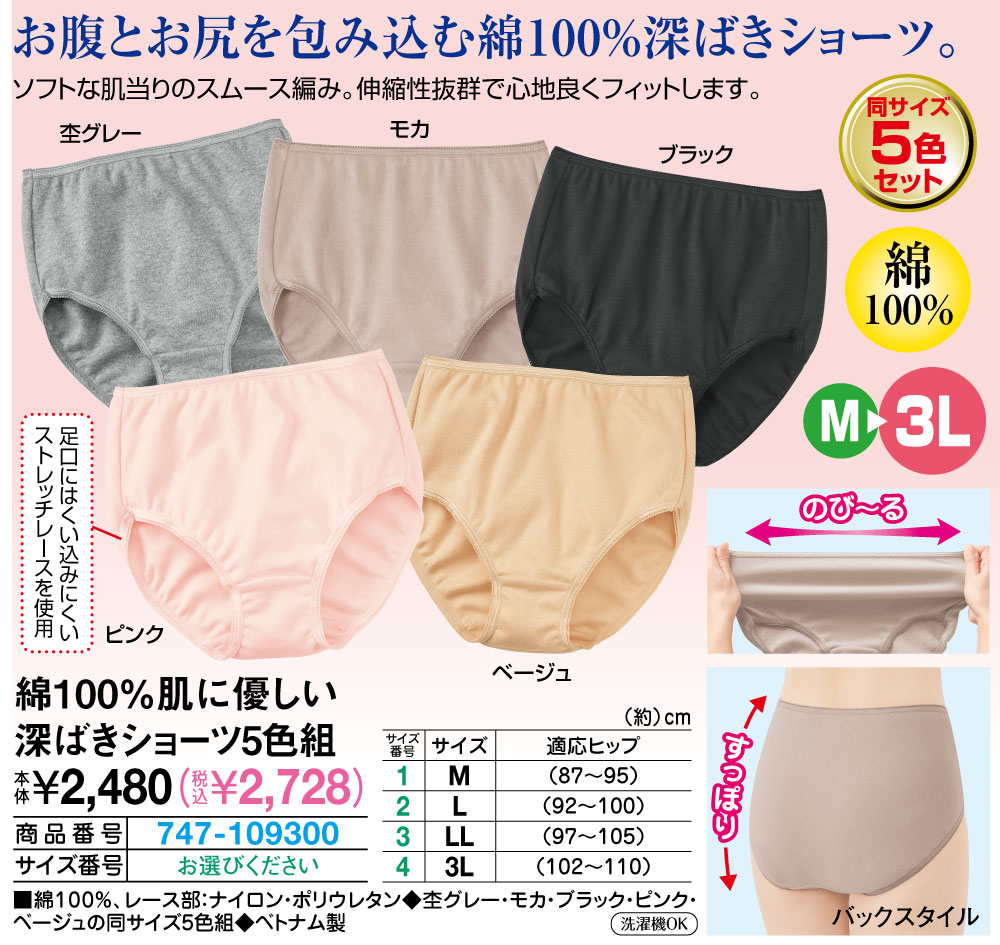 肌に優しい綿100%深ばきスムース編みショーツ! お腹もお尻もすっぽり包み込んで安心。伸縮性抜群で心地良くフィットします。 足口にはくい込みにくいストレッチレースを使用 のび~る すっぽり ●同サイズ5色セット ●M~3L