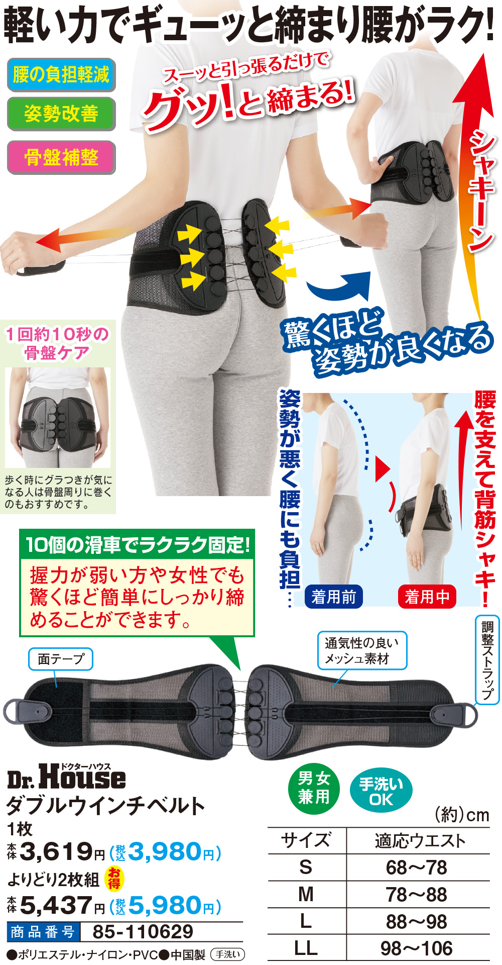 10個の滑車でラクラク固定!軽い力でスーッと引っ張るだけでグッと締まります! 腰に巻き面テープで固定したあと、取手を引っ張り締め上げるだけ! 握力が弱い方や女性でも驚くほど簡単にしっかり締めることができます。 服の下に着ても目立ちにくい。 歩く時にグラつきが気になる人は骨盤周りに巻くのもおすすめです。 ◎腰の負担軽減 ◎姿勢改善 ◎骨盤補整