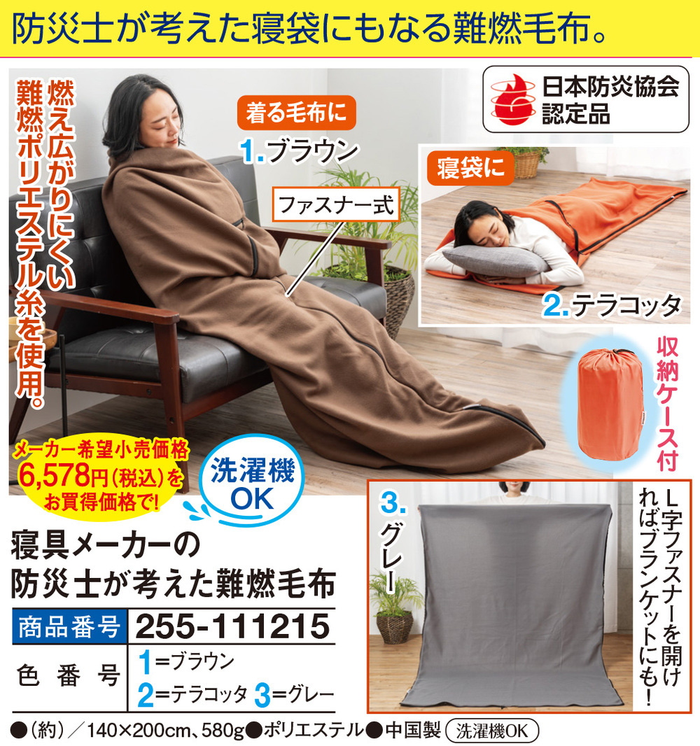 防災士が考えた寝袋にもなる難燃毛布! 燃え広がりにくい難燃ポリエステル糸を使用。 ●日本防災協会認定品 L字ファスナーを開ければブランケットにも! ●着る毛布に ●寝袋に ファスナー式 収納ケース付