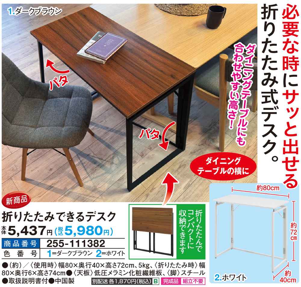 必要な時にサッと出せる折りたたみ式デスク! ダイニングテーブルにも合わせやすい高さ! 折りたたんでコンパクトに収納できます ●ダイニングテーブルの横に