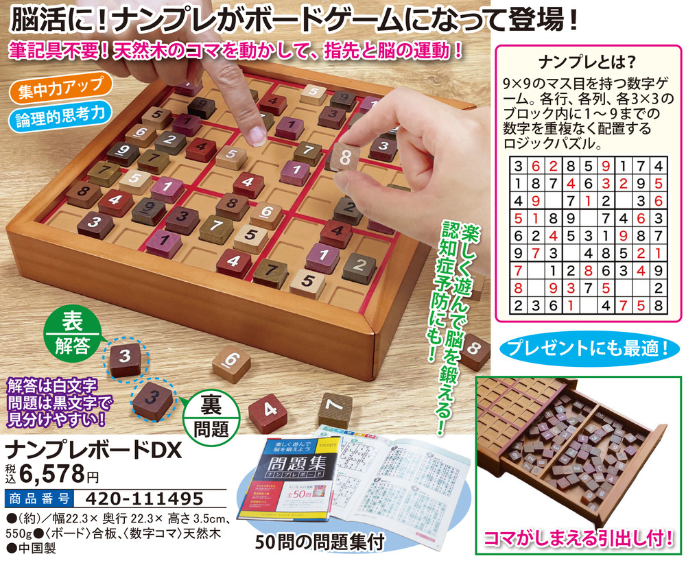 ●筆記具不要!天然木のコマを動かして、指先と脳の運動! ●楽しく遊んで脳を鍛える!認知症予防にも! ●解答は白文字 問題は黒文字で見分けやすい! ●コマがしまえる引出し付! ●50問の問題集付 ●プレゼントにも最適! ◎集中力アップ ◎論理的思考力 【ナンプレとは?】 9×9のマス目を持つ数字ゲーム。各行、各列、各3×3のブロック内に1~ 9までの数字を重複なく配置するロジックパズル。