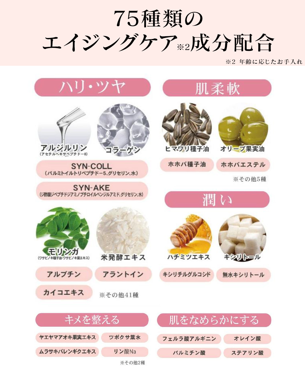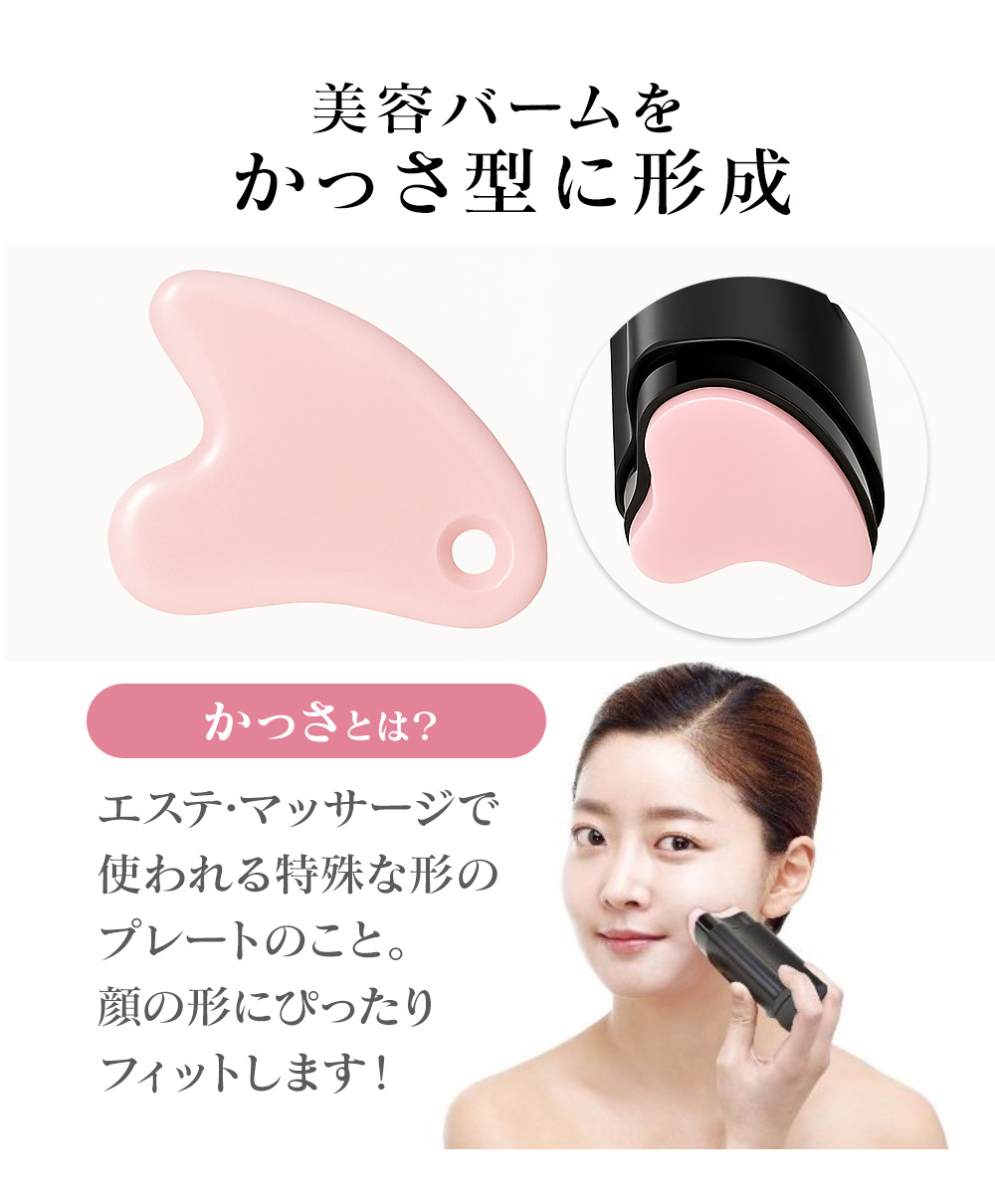 引き上げながら保湿する。 新発想!かっさ型固形美容液バーム! 1本で8役!多機能バームが、朝晩のケアに大活躍! 【美容液・乳液・クリーム・アイクリーム・かっさ・マッサージオイル・フェイスマスク・化粧下地】 ◎朝メイク前に 色ムラを整えて簡単トーンアップ(※物理的なメイクアップ効果による) ◎夜のスキンケアに 化粧水のあとに使えば、うるおいとハリ感を同時にケア。 かっさ型のバームが、体温でじゅわっととろけて肌になじみます。 目元、口元、額、首元など年齢サインが気になる部分にぴったりです。 下から上へ引き上げるように塗布することで、肌にピタッと密着。 75種類以上の美容成分配合。 ●使用方法 バームを手のひらで温め角が丸くなるように馴染ませペタペタくっつくようになればOK。 洗顔後、化粧水でお肌を整えてから、バームでお肌を引き上げるように使用します。