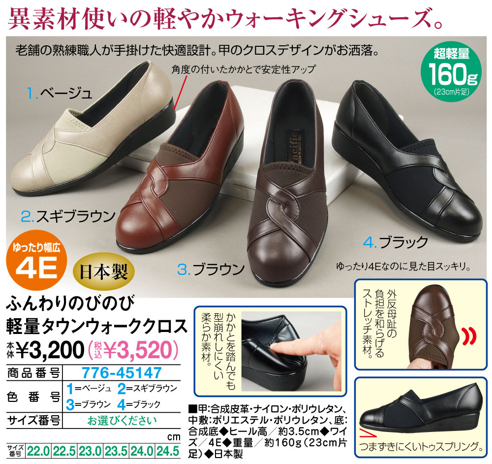 異素材使いの軽やかウォーキングシューズ! 老舗の熟練職人が手掛けた快適設計。 甲のクロスデザインがお洒落。 ゆったり4Eなのに見た目スッキリ。 外反母趾の負担をやわらげるストレッチ素材。 角度の付いたかかとで安定性アップ かかとを踏んでも型崩れしにくい柔らか素材。 つまずきにくいトゥスプリング。 ●ゆったり幅広4E ●超軽量160g(23cm片足)