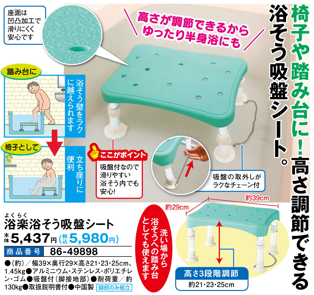 椅子に踏み台に!高さ調節できるバスタブシート! ●高さが調節できるからゆったり半身浴にも ●座面は凹凸加工で滑りにくく安心です ●吸盤の取外しがラクな、チェーン付! ●吸盤付なので滑りやすい浴そう内でも安心! ●洗い場から浴そうへの踏み台としても使えます 【踏み台に】深い浴そうでは踏み台にして、浴そう壁をラクに越えられます。 【椅子として】浴そう内では椅子にして、立ち座りに便利。 高さ3段階調節:約17.5・19.5・21.5cm