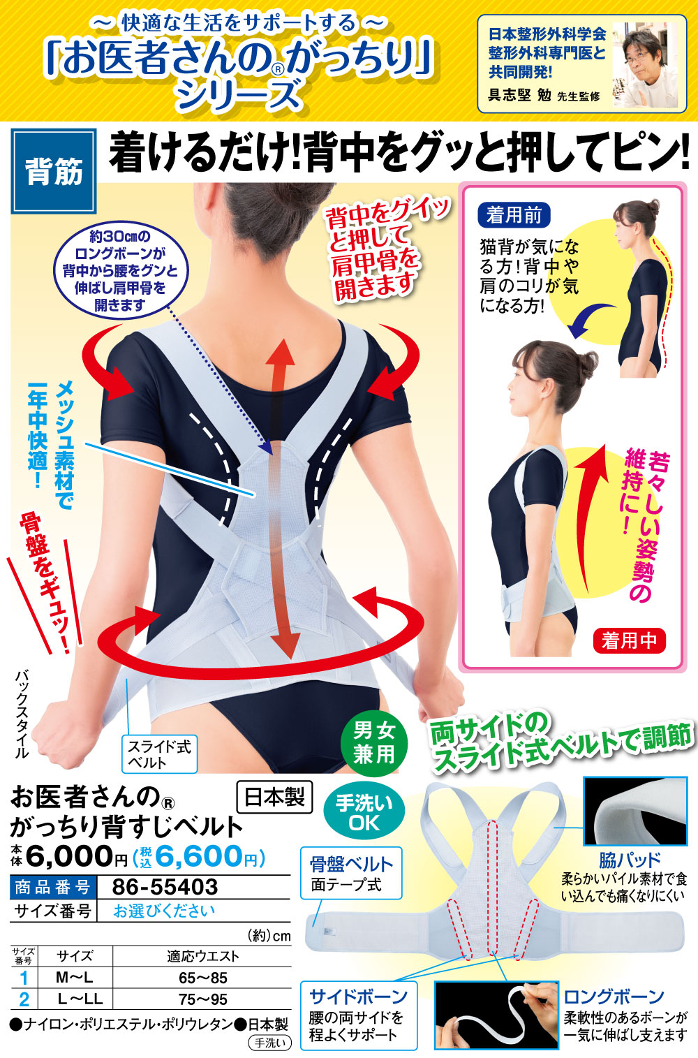 【日本製】着けるだけで背中をグッと押して背すじがピン! ~背中をグイッと押して肩甲骨をひらきます~ ●30cmのロングボーンが背中から腰をグンと伸ばします ●両サイドのスライド式ベルトを引っぱることで肩甲骨を押しだし背すじがピン!! ●手洗いOK ●スライド式ベルト 【骨盤ベルト】…面ファスナー式 【脇パッド】…柔らかいパイル素材で食い込んでも痛くなりにくい 【サイドボーン】…腰の両サイドを程よくサポート \日本整形外科学会整形外科専門医と共同開発!/ ぐしけん整形外科 クリニック院長 具志堅 勉 監修 <使用前> 猫背が気になる方! 背中や肩のコリが気になる方! <使用中> 若々しい姿勢の維持に…
