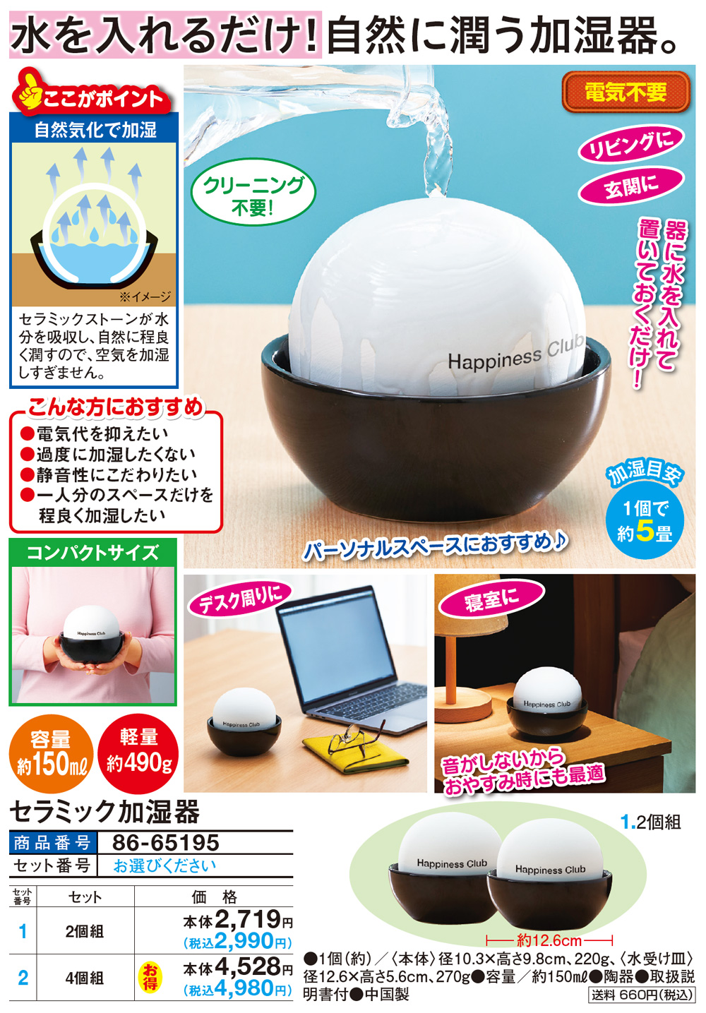 水を入れるだけ!自然に潤う加湿器! 電気不要。 器に水を入れて置いておくだけ! クリーニング不要! \ここがポイント/ 自然気化で加湿。 セラミックストーンが水分を吸収し、自然に程良く潤すので、空気を加湿しすぎません。 音がしないからおやすみ時にも最適。 加湿目安 1個で約5畳 コンパクトサイズ パーソナルスペースにおすすめ♪ ●リビングに ●玄関に ●デスク周りに ●寝室に \こんな方におすすめ/ ●電気代を抑えたい ●過度に加湿したくない ●静音性にこだわりたい ●一人分のスペースだけを程良く加湿したい