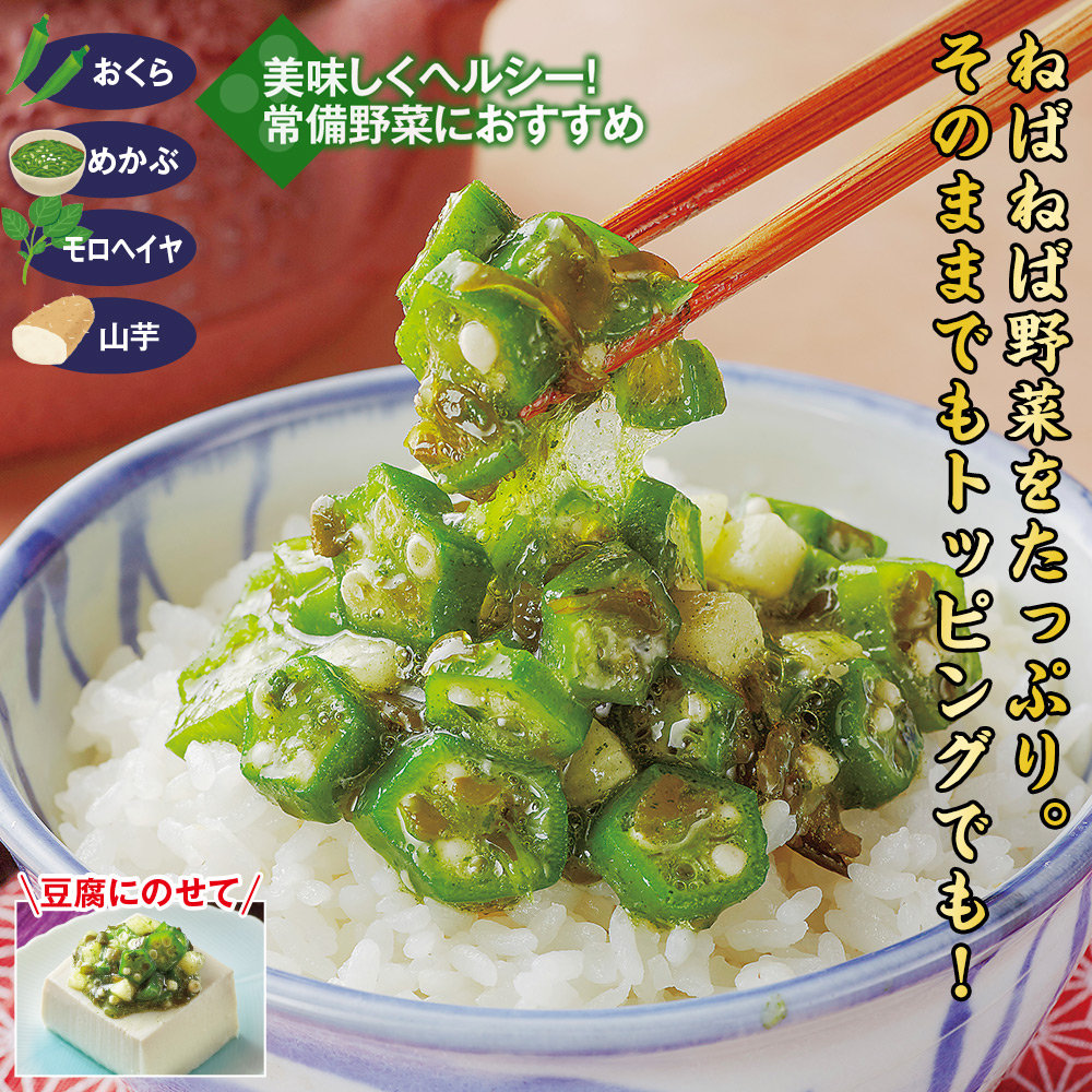 美味しくヘルシー!常備野菜におすすめ。 めかぶ、おくら、モロヘイヤ、山芋といった食物繊維豊富なねばねば野菜を組み合わせました。爽やかなしその香りで食が進みます。 豆腐にのせて! ・おくら・めかぶ・モロヘイヤ・山芋