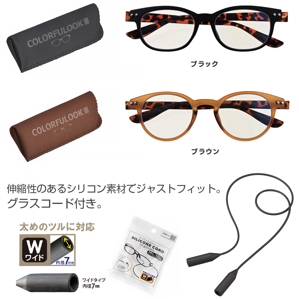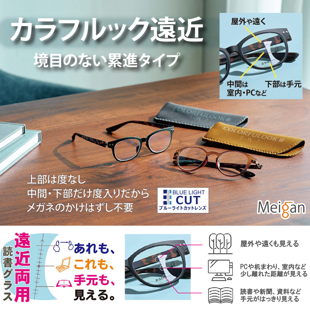 「手元がみえづらく老眼鏡をかけているけれど、遠くもみたいので掛外ししている」 そんな方にぴったりな「遠くもみえる老眼鏡」がカラフルック遠近です。 レンズ上部は度なし、その下は度ありの「多焦点レンズ」。 中心を使ってみると遠くが見えて、レンズの下側を使ってみると近くが見やすくなります。 遠くも見えるので、掛外し不要です! 老眼鏡の度数は「中程度」の+1.5と「強め」の+2.5。 ブルーライトカットレンズ使用(青色光約20%カット) JMDNコード:35065000