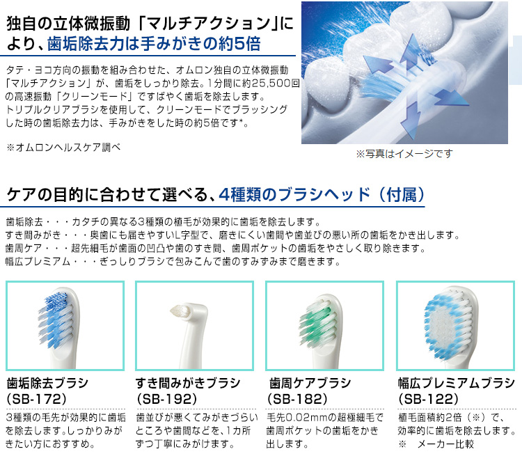 ●タテ方向とヨコ方向の振動を組み合わせた立体的な振動により、毛先が楕円運動を行います。歯の表面だけでなく歯のすき間や凹凸に毛先が入りこみ、歯垢を効果的に除去します。