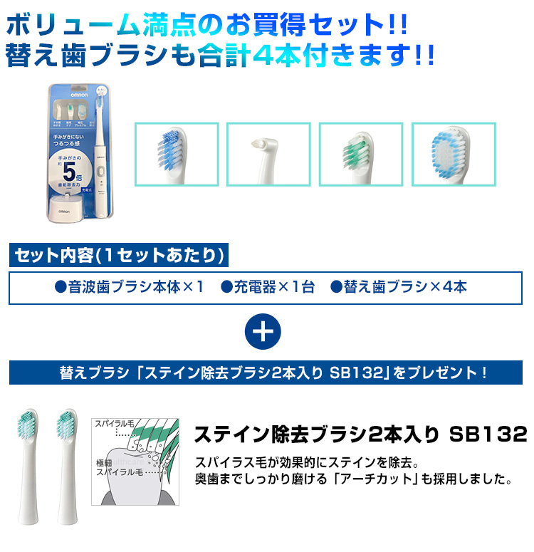 【セット内容(1セットあたり)】音波歯ブラシHT-B304×1台、充電台×1、ブラシスタンド×1、替え歯ブラシSB172×1、替え歯ブラシSB182×1、替え歯ブラシSB192×1、替え歯ブラシSB122×1、替え歯ブラシSB132×2
