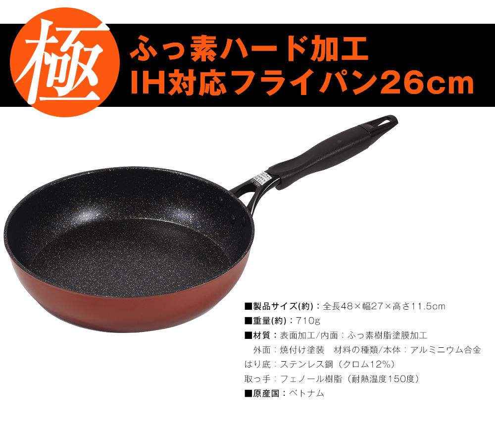 <20cm・26cmフライパン> 【サイズ・重量(約)】<20cm>全長40.5×幅21×高さ10cm、鍋の深さ:5cm、460g<26cm>全長48×幅27×高さ11.5cm、鍋の深さ:5.5cm、710g 【表面加工】内面/ふっ素樹脂塗膜加工、外面/焼付け塗装 【素材・材質】本体/アルミニウム合金、はり底/ステンレス鋼、取っ手/フェノール樹脂(耐熱温度150度) ◎ベトナム製 <三徳包丁> ●(約)/全長295mm(刃渡り165mm)、110g ●ステンレス鋼(両刃付け)、ポリプロピレン <キッチンはさみ> ●(約)/全長200mm(刃渡り75mm/重量)、78g ●ステンレス鋼、ポリプロピレン <まな板> ●(約)/横320×縦210×厚み2mm、135g ●ポリプロピレン <ピーラー> ●(約)/幅80×長さ135mm(刃38mm)/重量35g ●ステンレス鋼、ポリプロピレン
