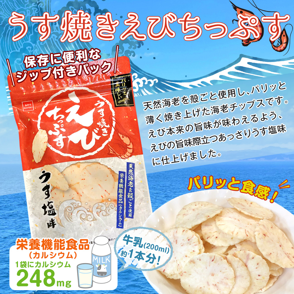 ●概要:天然海老を殻ごと使用し、パリッと薄く焼き上げた海老チップスです。 えび本来の旨味が味わえるよう、えびの旨味際立つあっさりうす塩味に仕上げました。 ●1袋にカルシウム248㎎=牛乳(200ml)約1本分 ●栄養機能食品(カルシウム) カルシウムは骨や歯の形成に必要な栄養素です。 ●保存に便利なジップ付きパックです。