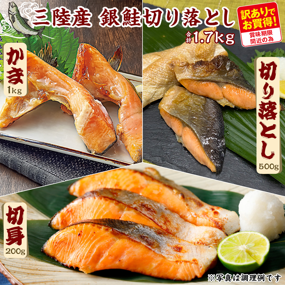 ●セット内容/<かま>500g×2<切り落とし>500g×1<切身>200g(3切) ●賞味期限/冷凍2026年1月31日 ●加工地/日本 ●原材料/<かま>銀鮭(三陸産)、食塩<切り落とし>銀鮭(三陸産)、食塩<切身>銀鮭(三陸産)、食塩 ●特定原材料等 /<かま>さけ<切り落とし>さけ<切身>さけ