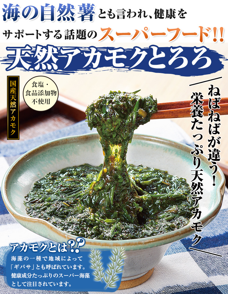 古くから食べられてきた海藻の1種です。(昆布やわかめ、めかぶと同じ海藻の仲間)海のスーパーフードと呼ばれる程栄養価が豊富!ビタミンやミネラル、アミノ酸がたっぷり。