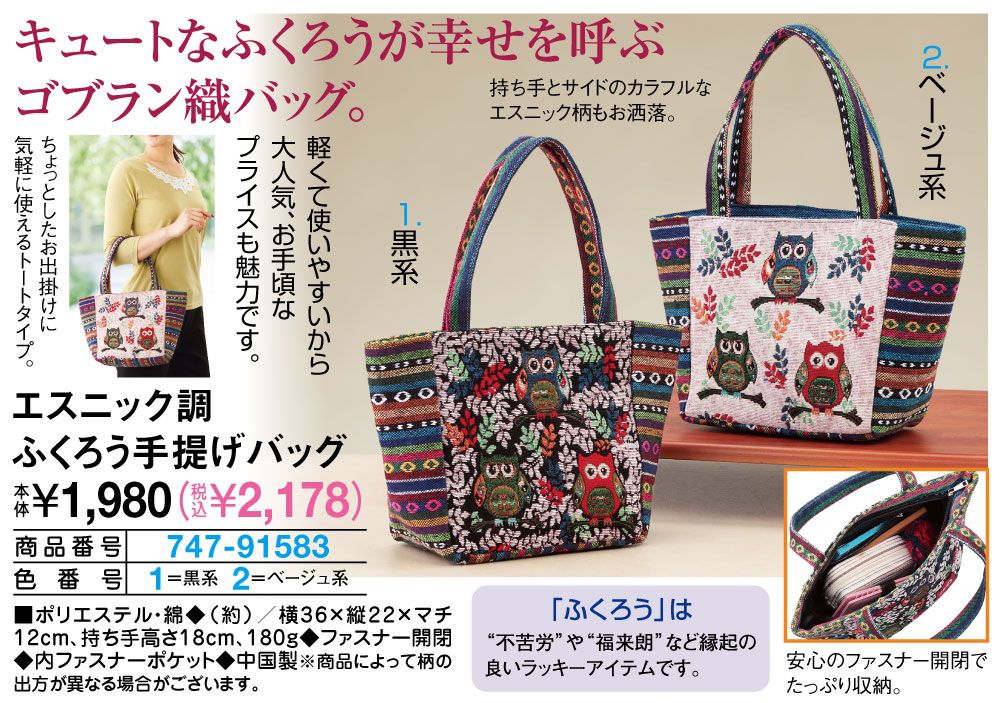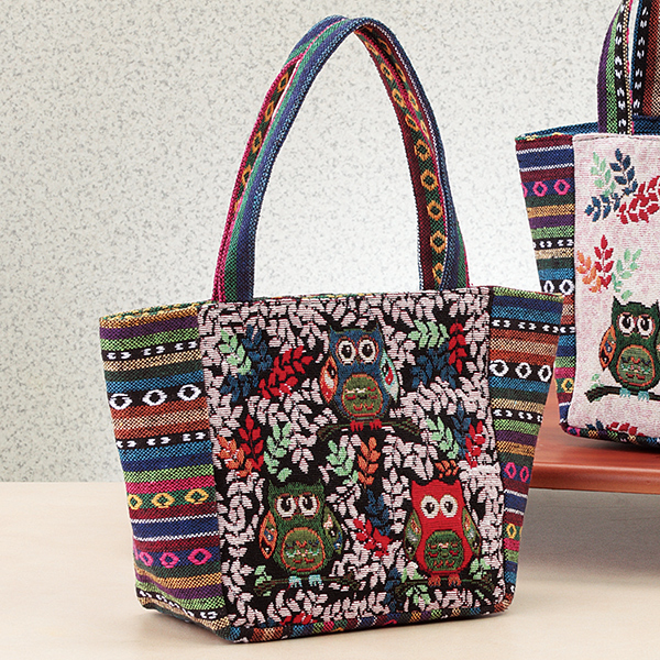キュートなふくろうが幸せを呼ぶゴブラン織バッグ! 軽くて使いやすいから大人気、お手頃なプライスも魅力です。 持ち手とサイドのカラフルなエスニック柄もお洒落。 ちょっとしたお出掛けに気軽に使えるトートタイプ。 安心のファスナー開閉で、たっぷり収納。 【「ふくろう」は】 “不苦労”や“福来朗”など縁起の良いラッキーアイテムです。