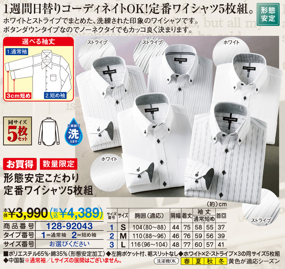 袖丈通常【サイズ(約)】 胸囲(適応)、肩幅、着丈、袖丈 <S>104(80~88)cm、44cm、75cm、58cm <M>110(88~96)cm、46cm、76cm、59cm <L>116(96~104)cm、48cm、77cm、60cm 袖丈短め【サイズ(約)】 胸囲(適応)、肩幅、着丈、袖丈 <S>104(80~88)cm、44cm、75cm、55cm <M>110(88~96)cm、46cm、76cm、56cm <L>116(96~104)cm、48cm、77cm、57cm ■ポリエステル65%・綿35%(形態安定加工) ◆左胸ポケット付、裾スリットなし ◆ホワイト×2・ストライプ×3の同サイズ5枚組 ◆中国製