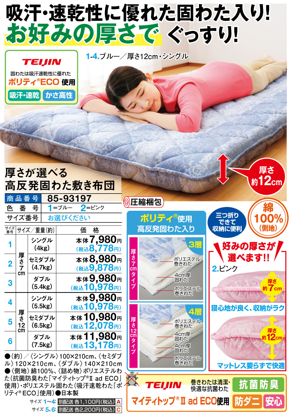 吸汗・速乾性に優れた固わた入り!お好みの厚さでぐっすり! 好みの厚さが選べます!! 寝心地が良く、収納がラク:厚さ約7cm マットレス要らずで快適:厚さ約12cm 【TEIJIN|固わたは吸汗速乾性に優れたポリティ(R)ECO使用】 ●吸汗・速乾 ●かさ高性 ポリティ(R)使用高反発固わた入り 厚さ約7cm:3層 厚さ約12cm:4層 【TEIJIN|マイティトップ(R)IIad ECO使用】 巻きわたは清潔・快適な抗菌わた ●抗菌防臭 ●防ダニ ●安心 三つ折りできて収納に便利 ●圧縮梱包