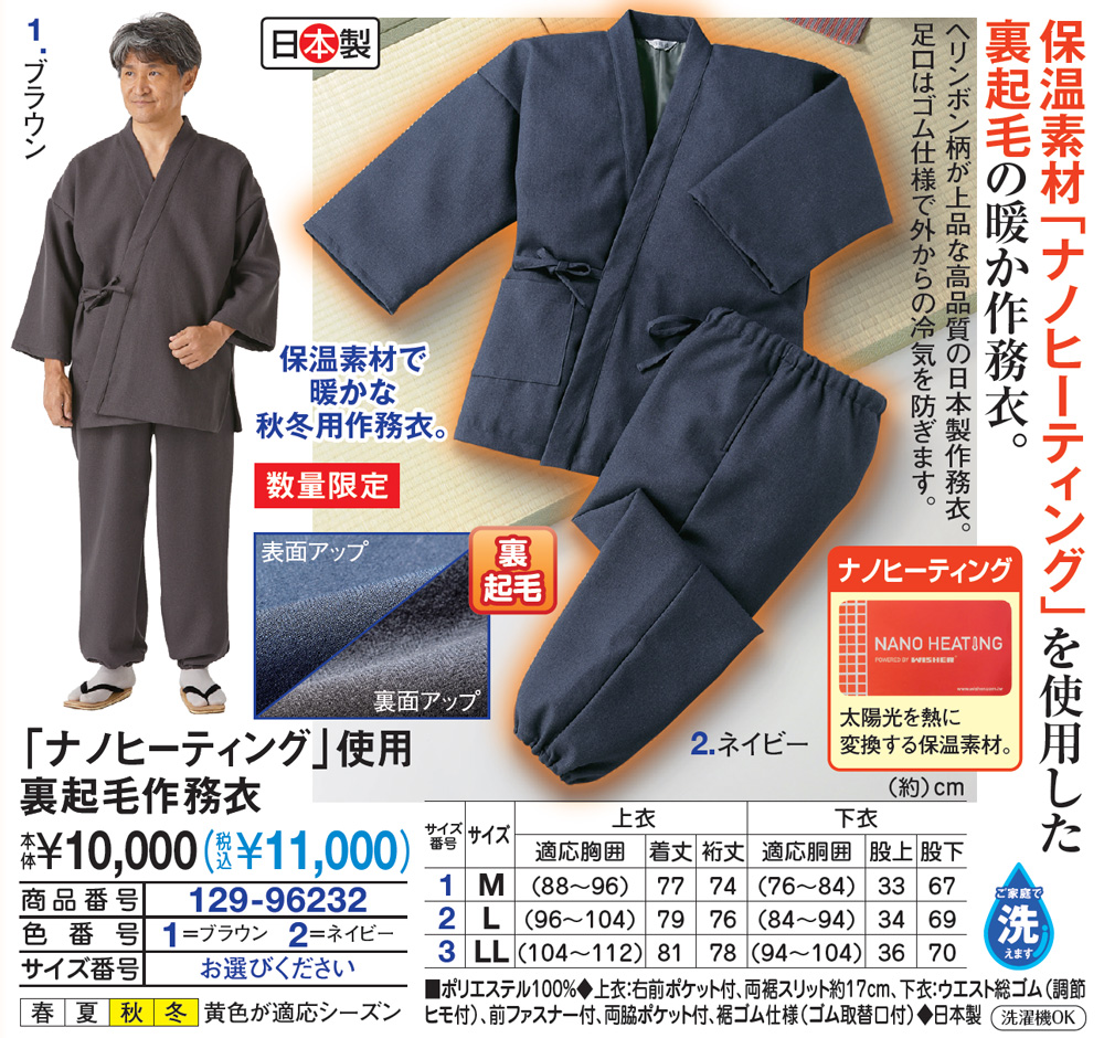 保温素材「ナノヒーティング」を使用した裏起毛の暖か作務衣! ヘリンボン柄が上品な高品質の日本製作務衣。 足口はゴム仕様で外からの冷気を防ぎます。 保温素材で暖かな秋冬用作務衣。 【ナノヒーティング】 太陽光を熱に変換する保温素材。 ●裏起毛 ●日本製