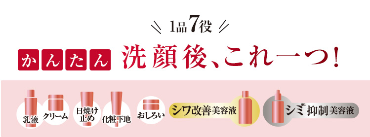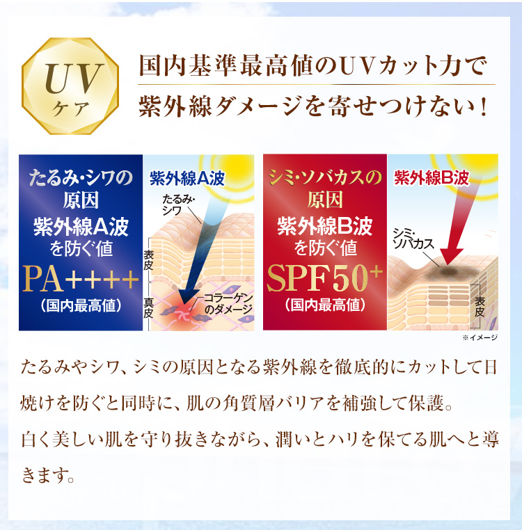 ※1 メラニンの生成を抑え、シミ、ソバカスを防ぎます。※2 年齢に応じた、ハリやうるおいのお手入れ。※3 SPF50+・PA++++であること。※4 精製水等を含む原料原液として。 ※6当社商品比較 ※9角質層 ※10年齢に応じた、ハリやうるおいのお手入れ。