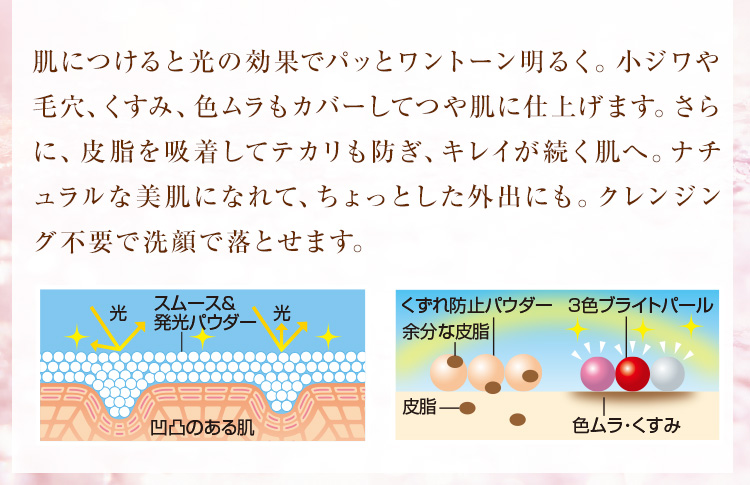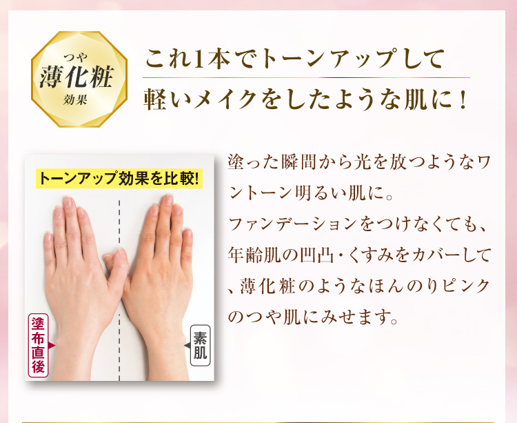 化粧水やゲルなどで肌を整えたあと、手のひらに適量を取り、顔全体にムラなくなじませます。手や首もとをはじめ、体にもご使用いただけます。