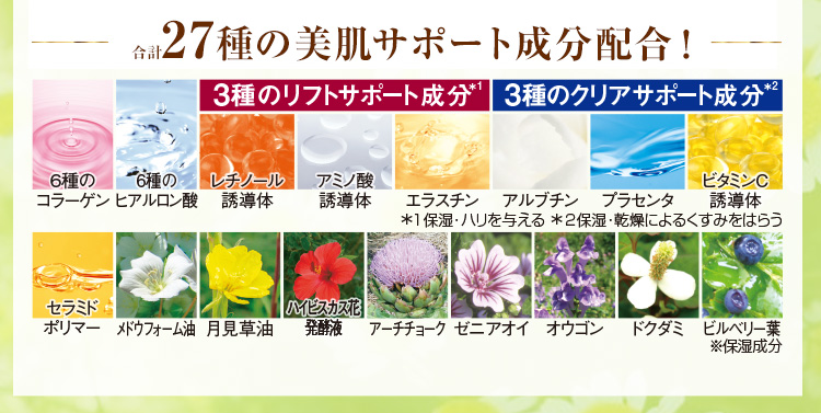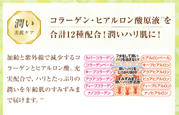 ※1 メラニンの生成を抑え、シミ、ソバカスを防ぎます。 ※2 年齢に応じた、ハリやうるおいのお手入れ。※4 精製水等を含む原料原液として。※9角質層