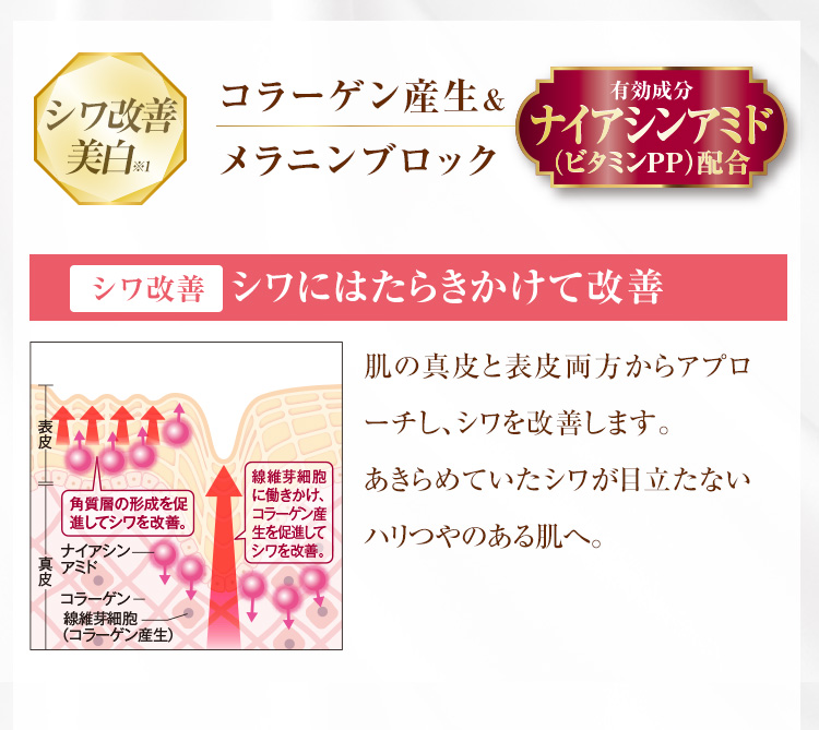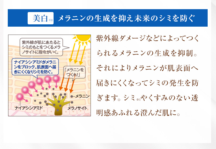 ※1 メラニンの生成を抑え、シミ、ソバカスを防ぎます。