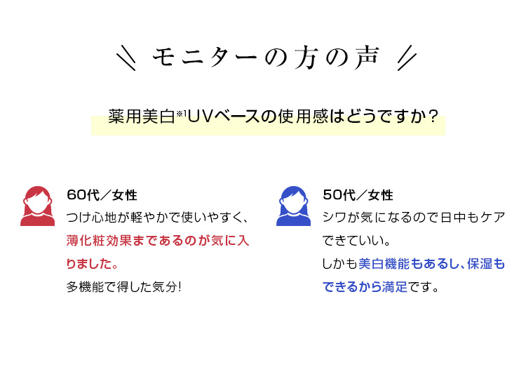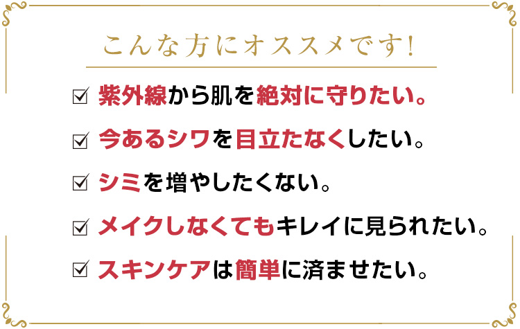 ※1 メラニンの生成を抑え、シミ、ソバカスを防ぎます。 ※2 年齢に応じた、ハリやうるおいのお手入れ。 ※3 SPF50+・PA++++であること