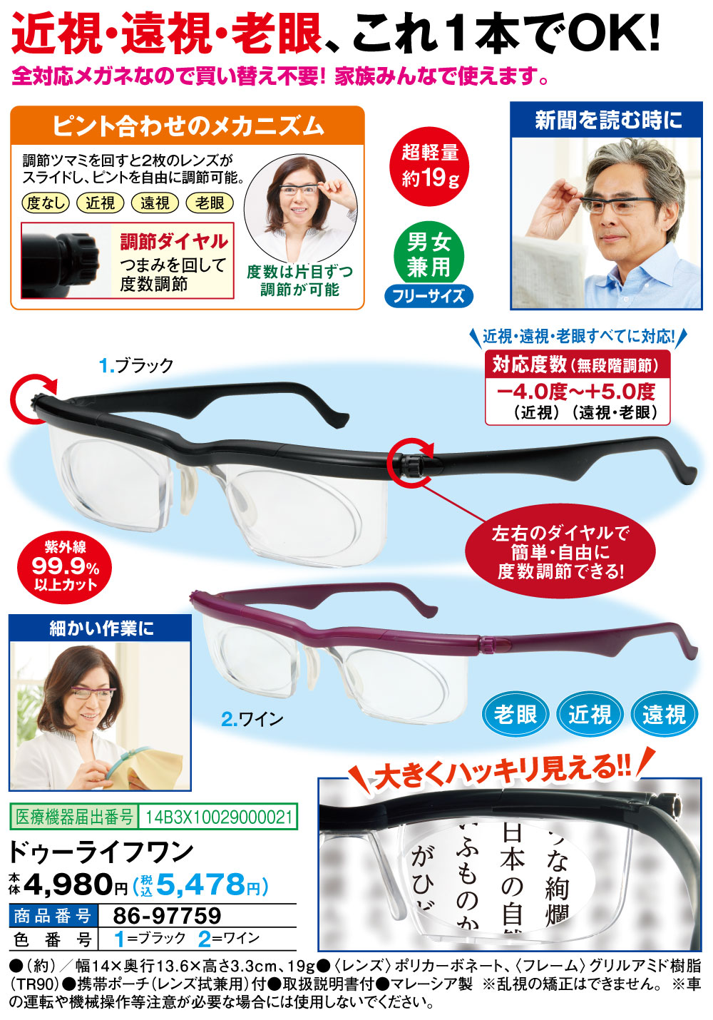 近視・遠視・老眼、これ1本でOK! 全対応メガネなので買い替え不要! 家族みんなで使えます。 新聞を読む時に 細かい作業に 【ピント合わせのメカニズム】 調節ツマミを回すと2枚のレンズがスライドし、ピントを自由に調節可能。 度数は片目ずつ調節が可能 ●度なし ●近視 ●遠視 ●老眼 \大きくハッキリ見える!!/ \ 近視・遠視・老眼すべてに対応!/ 【対応度数(無段階調節)】 -4.0度~(近視)+5.0度(遠視・老眼) 左右のダイヤルで簡単・自由に度数調節できる! ●超軽量約19g ●男女兼用 ●フリーサイズ ●紫外線99.9%以上カット 医療機器届出番号:14B3X10029000021
