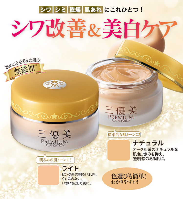 【内容量】1個:25g(約3カ月分) 【主な配合成分】和漢植物エキス、カプセルコラーゲン、カプセルヒアルロン酸、セラミド、スクワラン、エラスチン、ビタミンA誘導体、ビタミンC誘導体、ビタミンE誘導体 【カラー】 <ライト>ピンク系の明るい肌色。肌のくすみのないいきいきとした肌に。 <ナチュラル>オークル系のナチュラルな肌色。赤みを抑え、透明感のある肌に。 【販売名】 ライト/薬用三優美W、ナチュラル/薬用三優美N