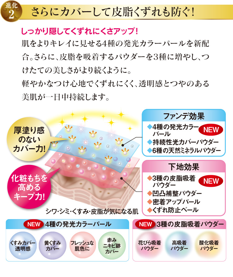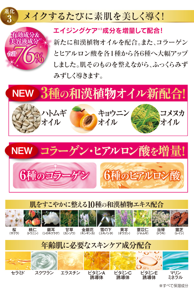 ※1無香料・合成着色料(タール色素)不使用・ノンアルコール・無鉱物油・パラベン不使用・紫外線吸収剤不使用・動物性原料不使用*1 ※3年齢に応じた、ハリやうるおいのお手入れ。 ※4無香料・無着色・ノンアルコール・無鉱物油・パラベン不使用・合成界面活性剤不使用・動物性原料不使用*1 ※5メラニンの生成を抑え、シミ、ソバカスを防ぎます。 *1ただし魚由来・真珠由来原料を使用しています。 *パッチテスト済み(すべての方に皮膚刺激が起きないというわけではありません)