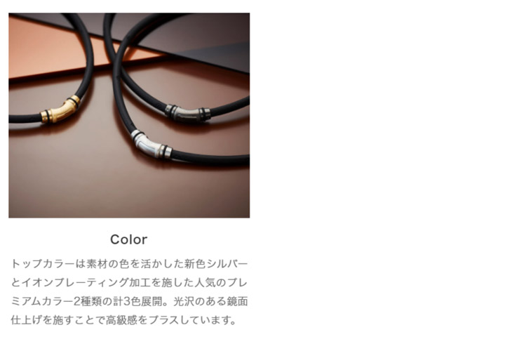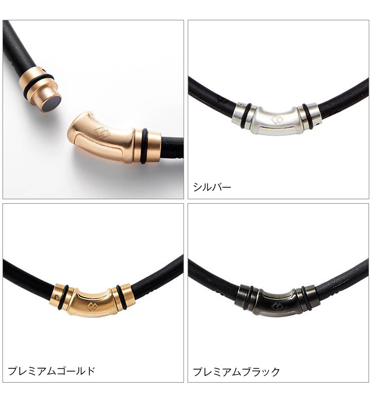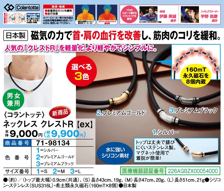 商品名:コラントッテ ネックレス CREST R【ex】(クレスト アール イーエックス) 品番:ABAPV 医療機器認証番号:226AGBZX00054000 適応サイズ:S(43cm)、M(47cm)、L(51cm) カラー:<ループ>ブラック <トップ・ジョイント>シルバー、プレミアムゴールド、プレミアムブラック 材質:シリコン、ステンレス(SUS316L) 磁石:希土類永久磁石160mT(1600G)8個をN極S極交互配列