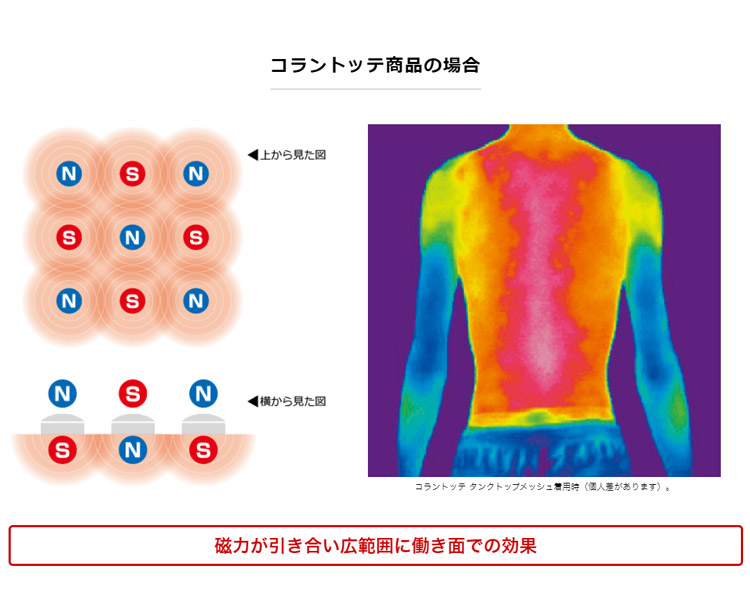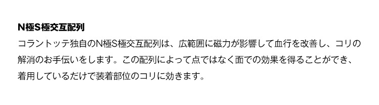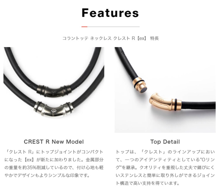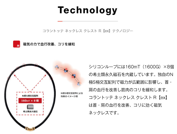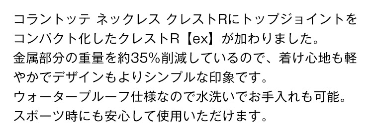 コラントッテ ネックレス CREST R【ex】 首・肩の血行改善、首のコリ・肩コリに効く 医療機器認証番号:226AGBZX00054000 <商品概要> コラントッテ ネックレス クレストRにトップジョイントをコンパクト化したクレストR【ex】が加わりました。 金属部分の重量を約35%削減しているので、着け心地も軽やかでデザインもよりシンプルな印象です。 ウォータープルーフ仕様なので水洗いでお手入れも可能。 スポーツ時にも安心して使用いただけます。 ───────── CREST R New Model ───────── 「クレスト R」にトップジョイントがコンパクトになった【ex】が新たに加わりました。 金属部分の重量を約35%削減しているので、付け心地も軽やかでデザインもよりシンプルな印象です。 ───────── Top Detail ───────── トップは、「クレスト」のラインアップにおいて、一つのアイデンティティとしている"Oリング"を継承。 クオリティを重視した丈夫で錆びにくいステンレスと簡単に取り外しができるジョイント構造で高い支持を得ています。 ───────── Color ───────── トップカラーは素材の色を活かした新色シルバーとイオンプレーティング加工を施した人気のプレミアムカラー2種類の計3色展開。 光沢のある鏡面仕上げを施すことで高級感をプラスしています。 ■Technology■ -------- ・磁気の力で血行改善、コリを緩和 -------- シリコンループには160mT(1600G)×8個の希土類永久磁石を内蔵しています。 独自のN極S極交互配列で磁力が広範囲に影響し、首・肩の血行を改善し筋肉のコリを緩和します。 コラントッテ ネックレス クレスト R【ex】は首・肩の血行を改善、コリに効く磁気ネックレスです。 -------- N極S極交互配列 -------- コラントッテ独自のN極S極交互配列は、広範囲に磁力が影響して血行を改善し、コリの解消のお手伝いをします。 この配列によって点ではなく面での効果を得ることができ、着用しているだけで装着部位のコリに効きます。