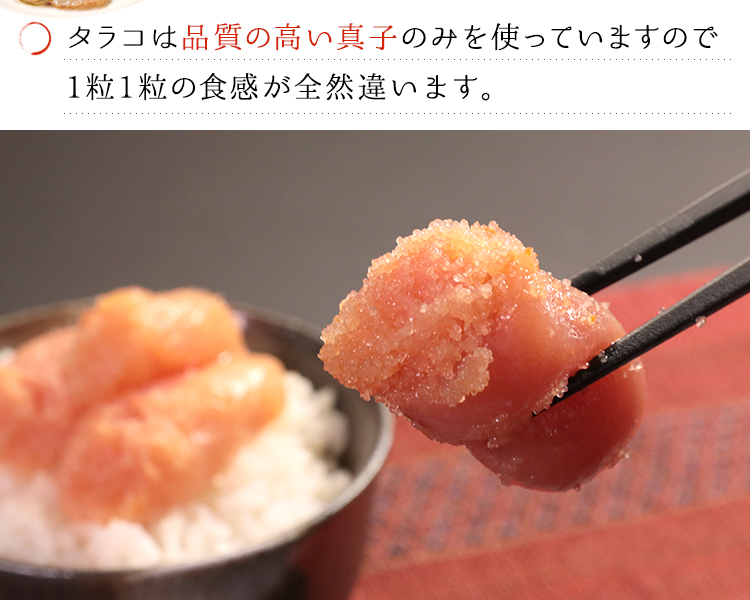 タラコは品質の高い真子のみを使っていますので1粒1粒の食感が全然違います。