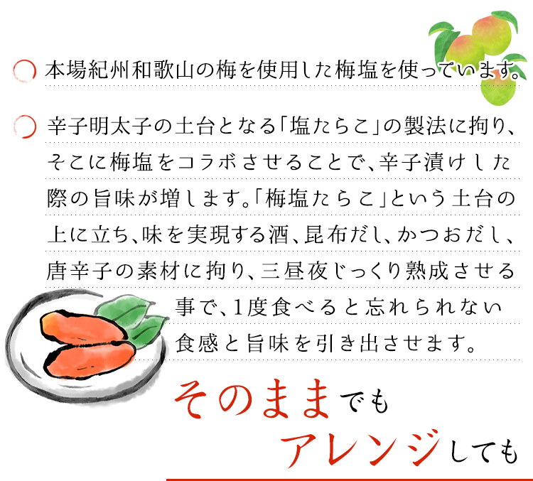 辛子明太子の土台となる「塩たらこ」の製法に拘り、そこに梅塩をコラボさせることで、辛子漬けした際の旨味が増します。