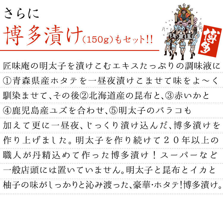 匠味庵の明太子を漬けこむエキスたっぷりの調味液に1.青森県産ホタテを一昼夜漬けこませて味をよ~く馴染ませて、その後2.北海道産の昆布と、3.赤イカと4.鹿児島産ユズを合わせ、5.明太子のバラコも加えて更に一昼夜、じっくり漬け込んだ、博多漬けを作り上げました。明太子を作り続けて20年以上の職人が丹精込めて作った博多漬け!スーパーなど一般店頭には置いていません。明太子と昆布とイカと柚子の味がしっかりと沁み渡った、豪華・ホタテ!博多漬け。