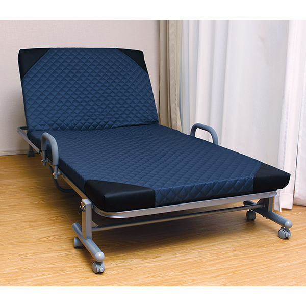 お手頃価格の14段階リクライニングベッド! ●背部:手動リクライニング ●来客用にもおすすめ マットは固わた+ウレタン使用で底つき感なし! 背もたれ部約57cm 落下防止にもなるサイドグリップ キャスター付2ヵ所ロック付 マット幅約85cm 【背もたれ14段階リクライニング】 お好みの角度でくつろげる 最大80度まで 【コンパクト収納】 布団を掛けたまま移動できます。